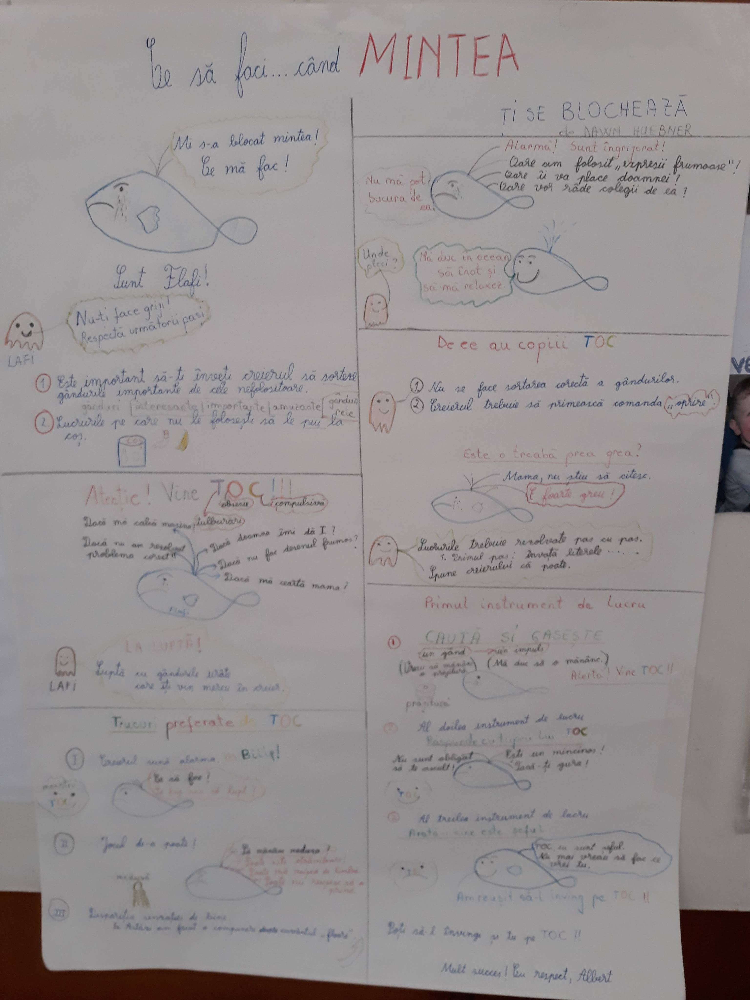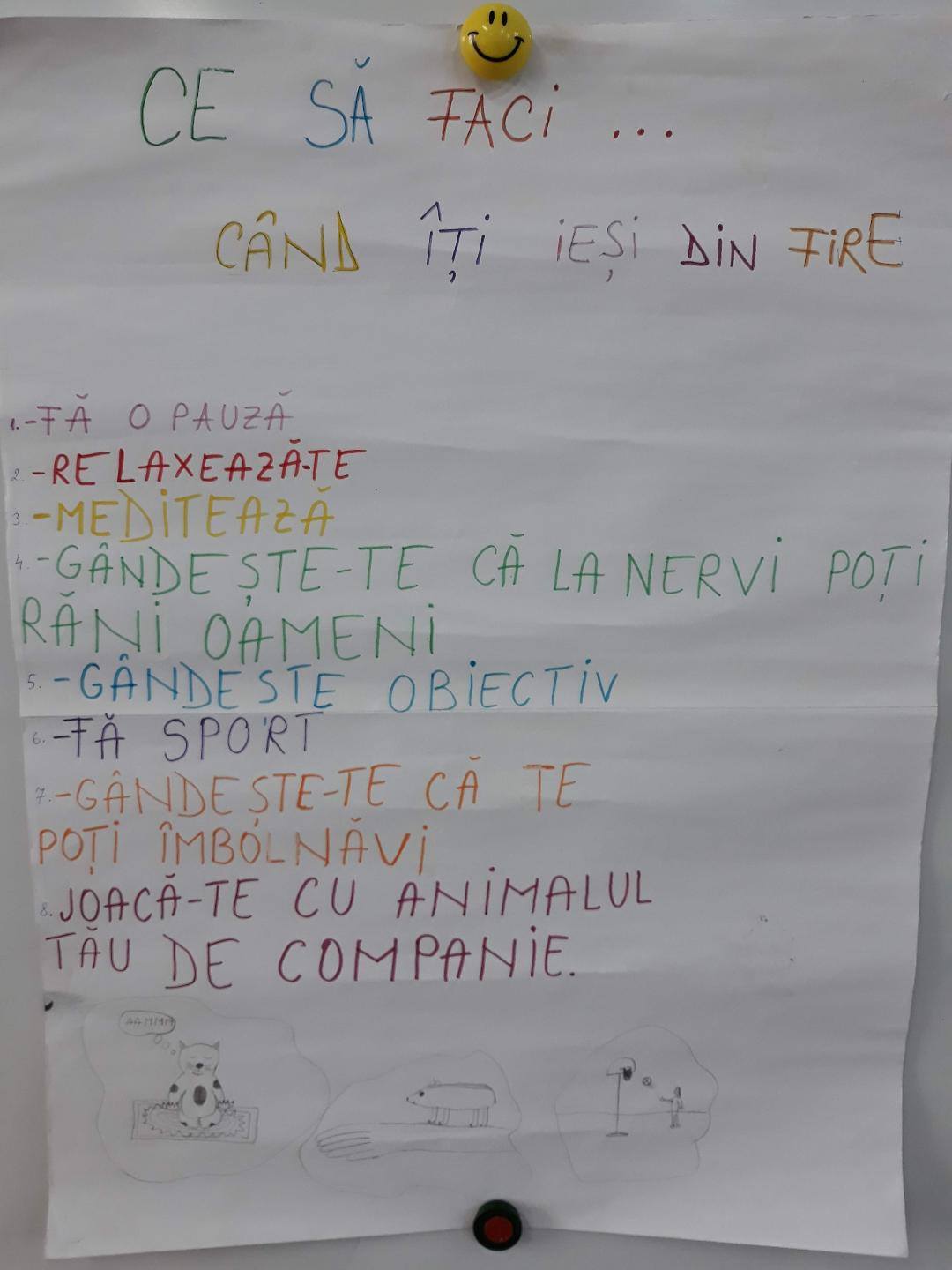 Faptul că Oana este atât de preocupată de dezvoltarea Inteligenței emoționale se vede încă de la intrarea în clasă. Un panou cu „Emoții creative” te întâmpină. Fiecare elev a prezentat într-un mod creativ cât mai multe emoții. Unii elevi au desenat diferite personaje din desene animate care transmit constant o anumită emoție, un alt elev a realizat un proiect cu poze în care este el la diferite vârste, având un nonverbal foarte descifrabil, emoțiile fiind foarte ușor de recunoscut.
